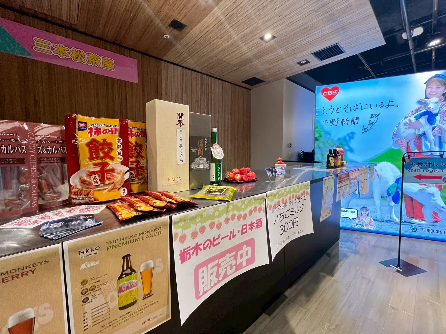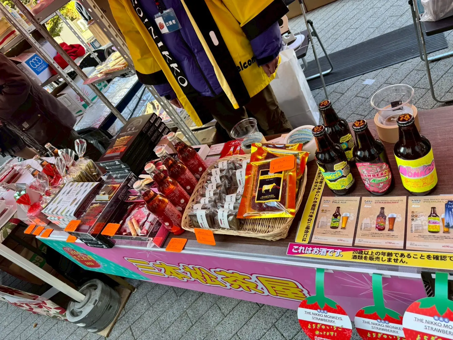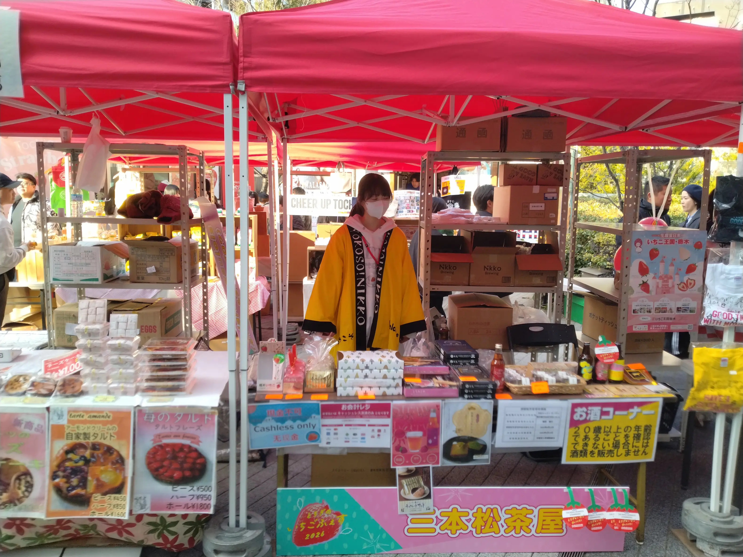 今年、私たち三本松茶屋は初めてとちぎのいちごふぇすで屋外物販テントとバーカウンターを出店させていただきました。屋外物販テントでは私たちの自社製クラフトビールや最上級の宇治抹茶を使用した抹茶フィナンシェなど、奥日光のおすすめお土産を買うことができます。バーカウンターでは自社製クラフトビール、地酒、栃木県産苺を使用したカクテル、いちごミルクなど、幅広く提供させていただきました。